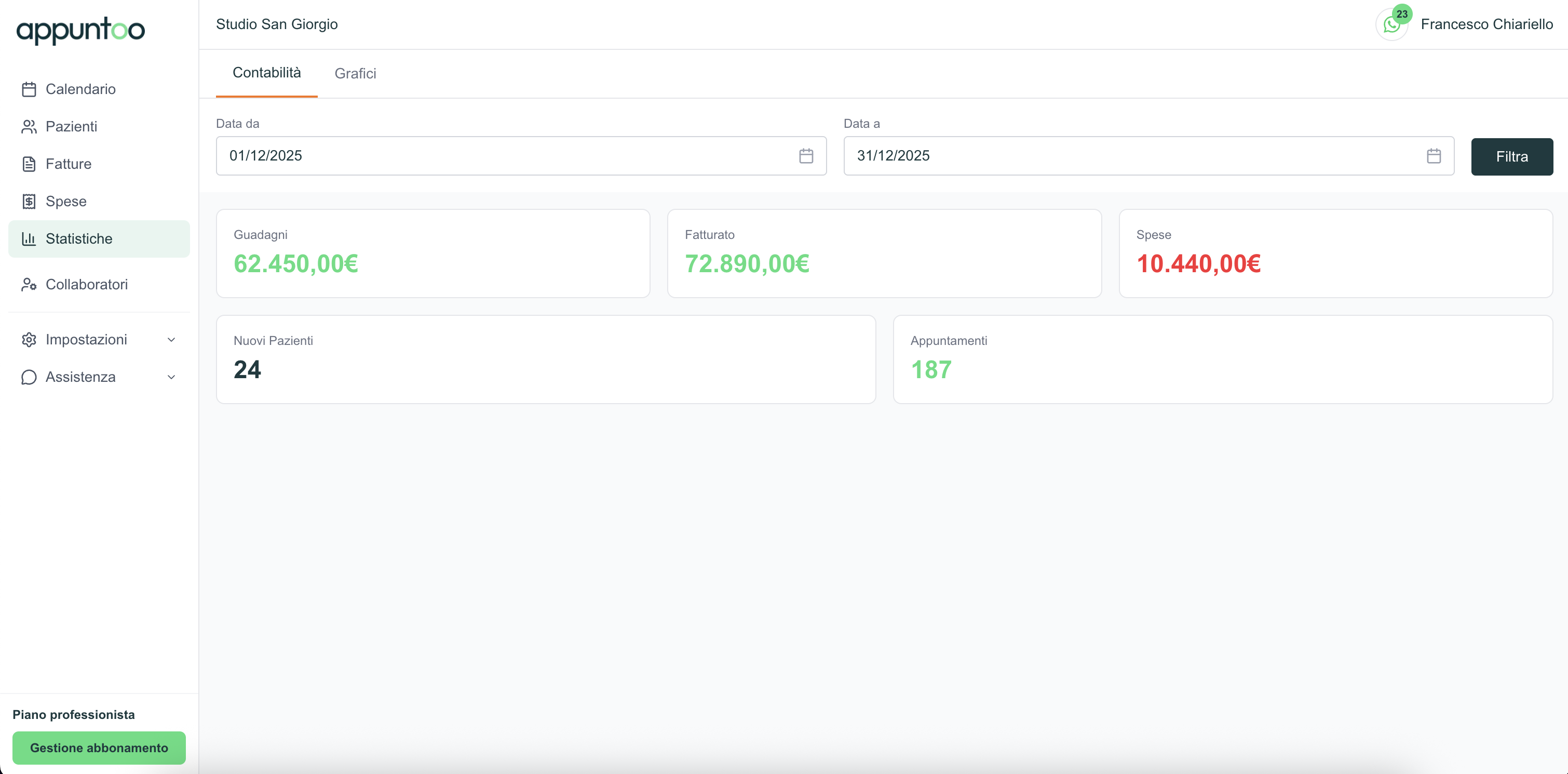Dashboard intuitiva con grafici che ti mostrano la crescita dello studio. Monitora l'utile netto e capisci a colpo d'occhio come sta andando la tua attività.